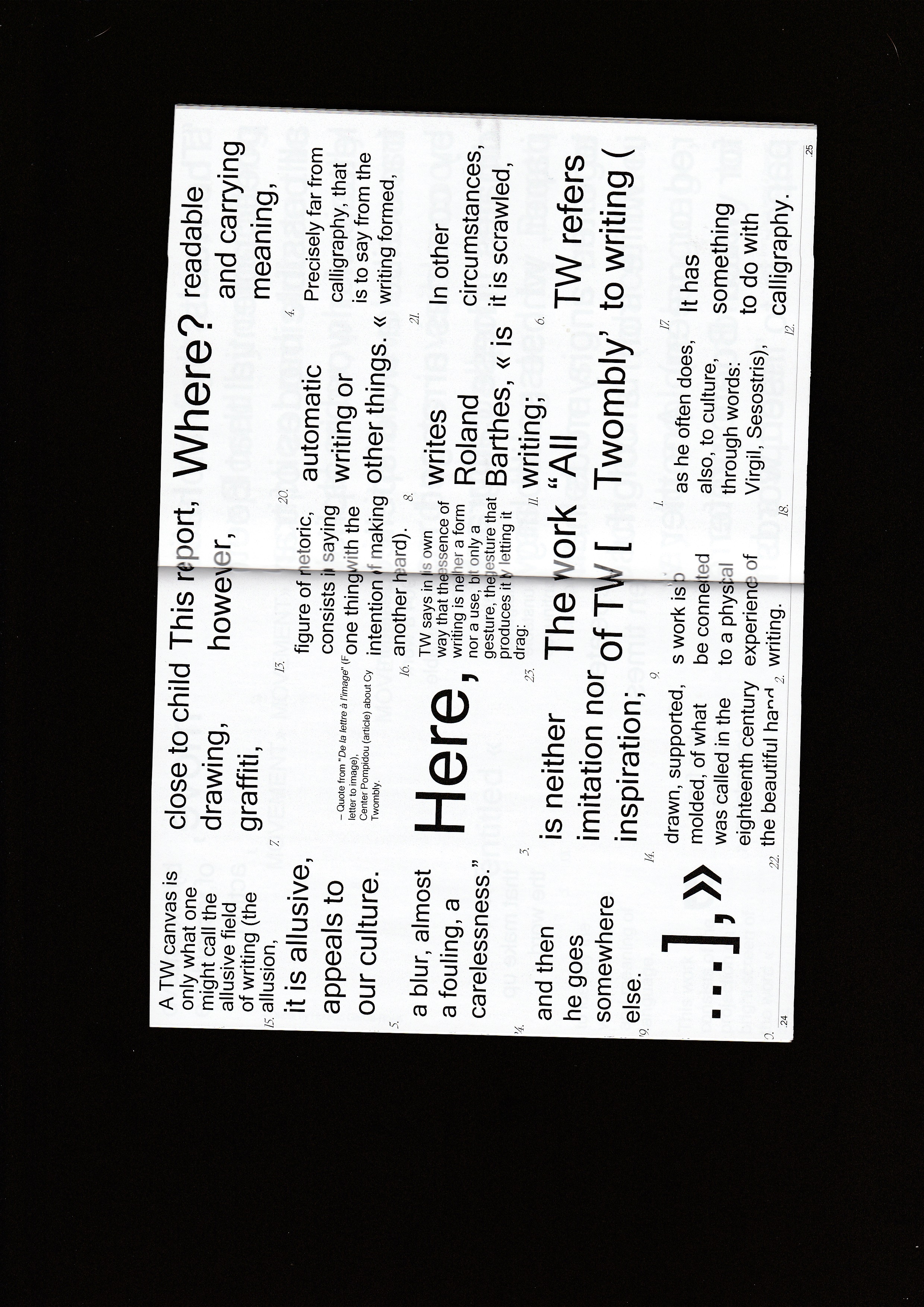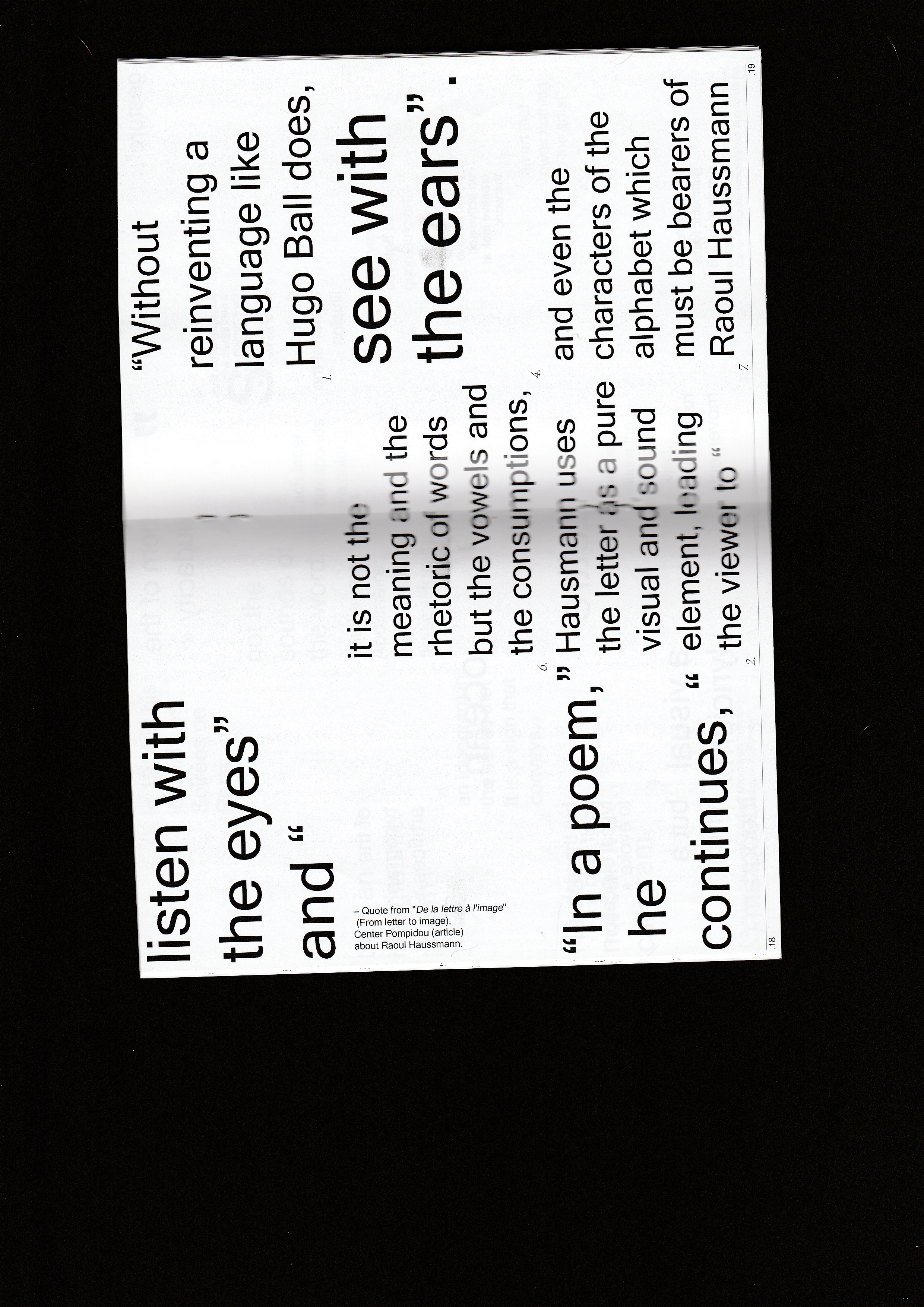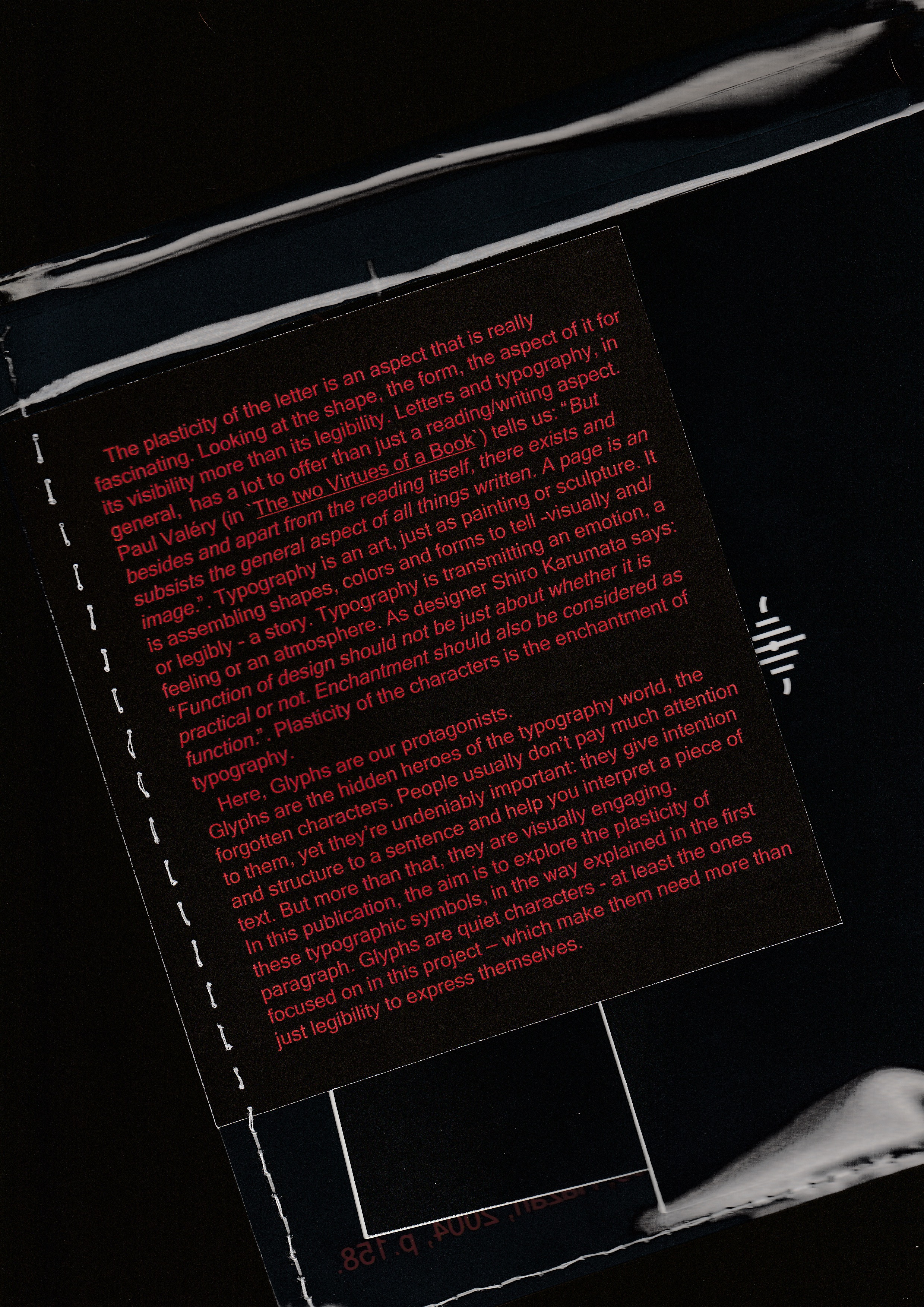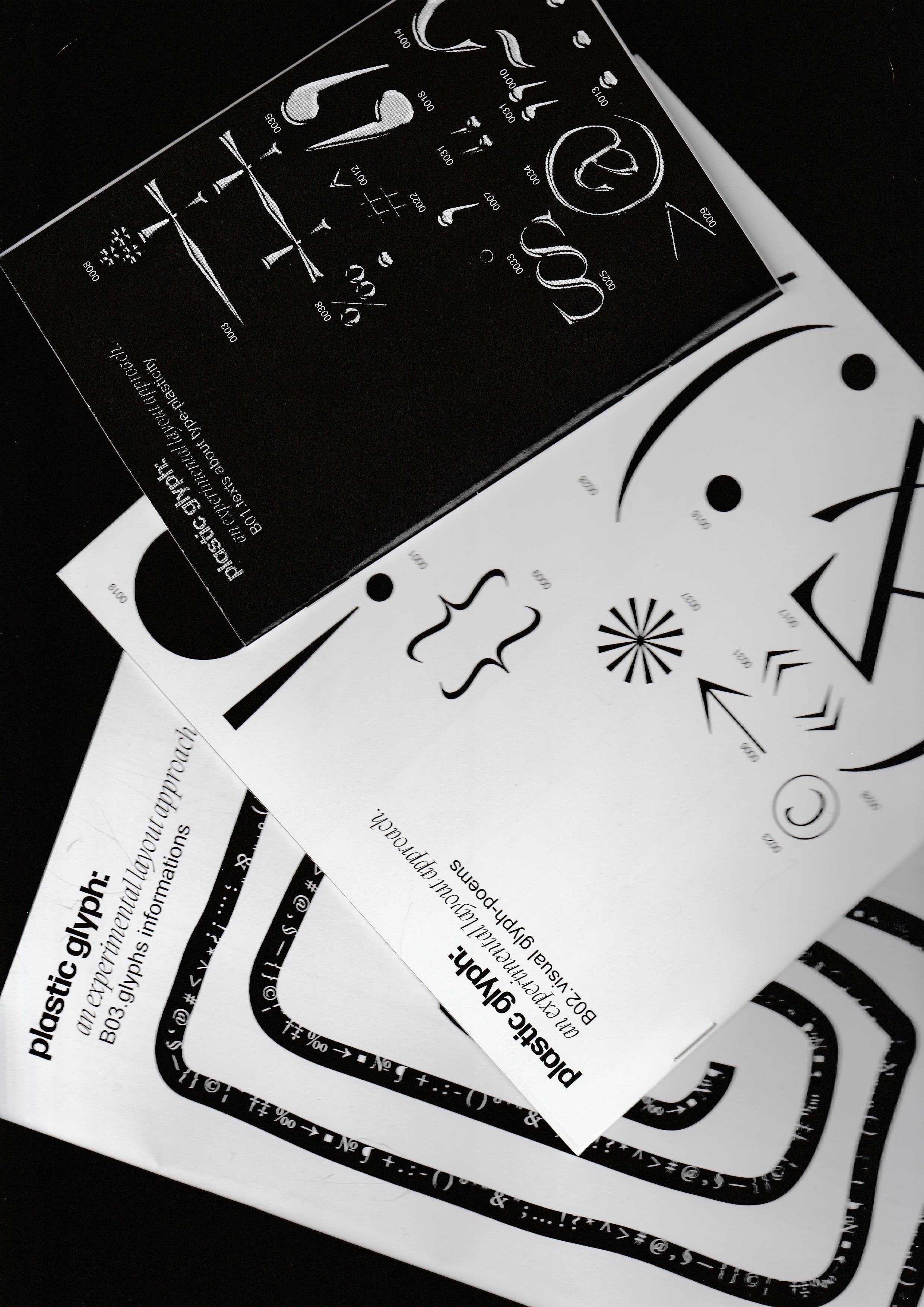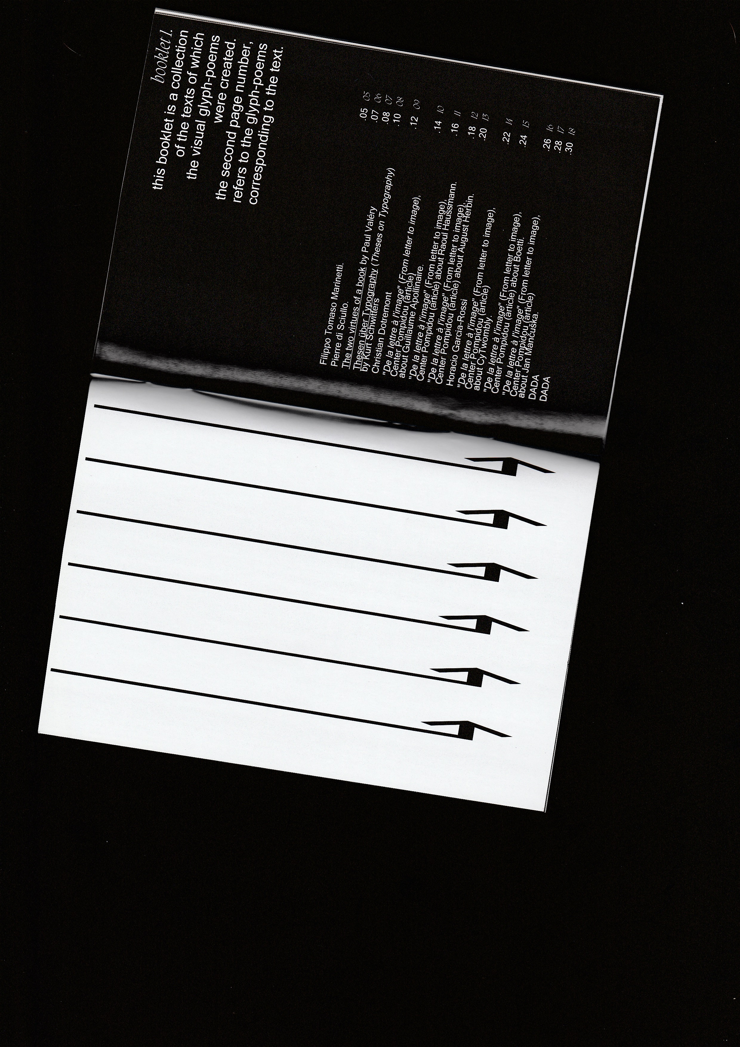 Self-directed project in which I played with the plasticity of the letter using glyphs as my main protagonist, informing my work with artists working on this same aspect such as Tristan Tzara, Marinetti, Boetti… The layout is made using a system based on texts from these artists.